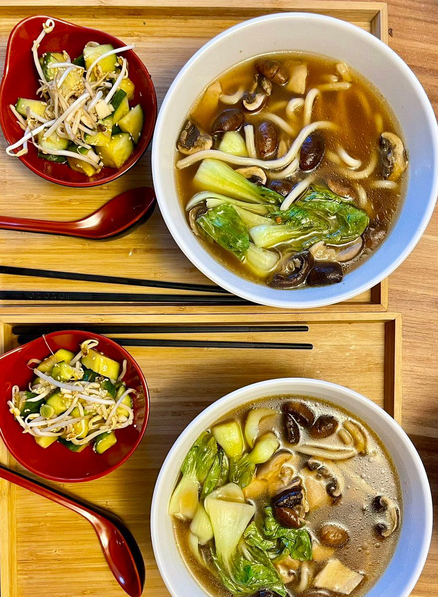 האודון של היום מוגש עם סלט מלפפונים ברוטב פונסו וסרירצ׳ה ירוקה בנוסח שנגחאי עם קצת אימפרוביזציות